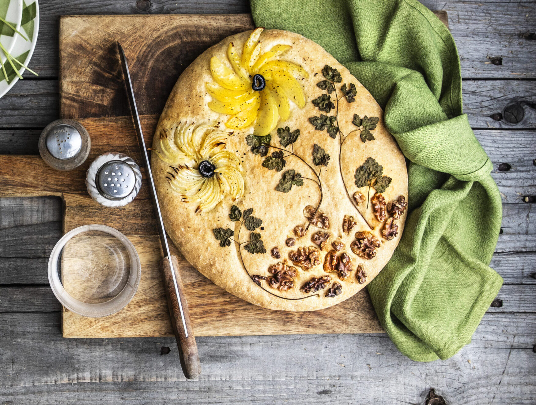 6. Oliatevi le mani e premete delicatamente sulla focaccia per schiacciarla un po’, poi decoratela cercando di ricreare un giardino. Da una parte formate 2 fiori mettendo nel centro della corolla mezza oliva e gli spicchi di patata e cipolla per simulare i petali, fate i gambi e l’erba con il prezzemolo, e poi la terra con i gherigli di noce. Premete di nuovo leggermente tutte le decorazioni con le mani oliate avendo cura che le foglie di prezzemolo aderiscano bene. Infine aggiungete poco pepe intorno ai fiori.