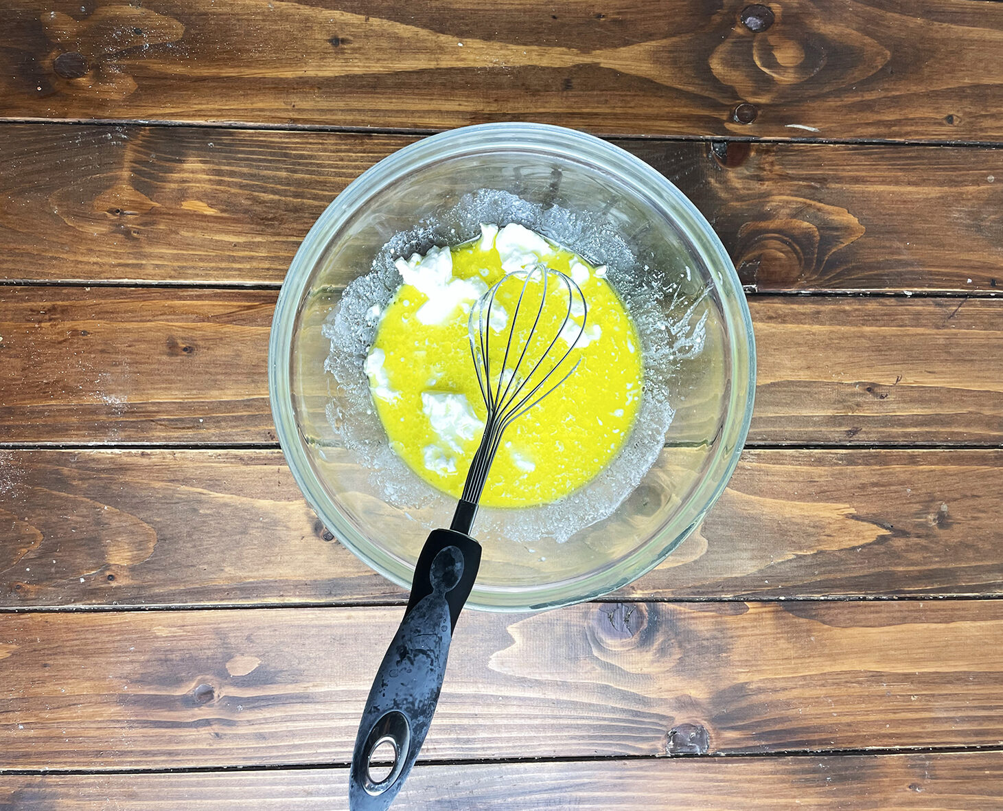 1. Mescolate in una ciotola 130 ml d’acqua tiepida con 130 g della ricotta, 35 ml di olio e un pizzico di sale.