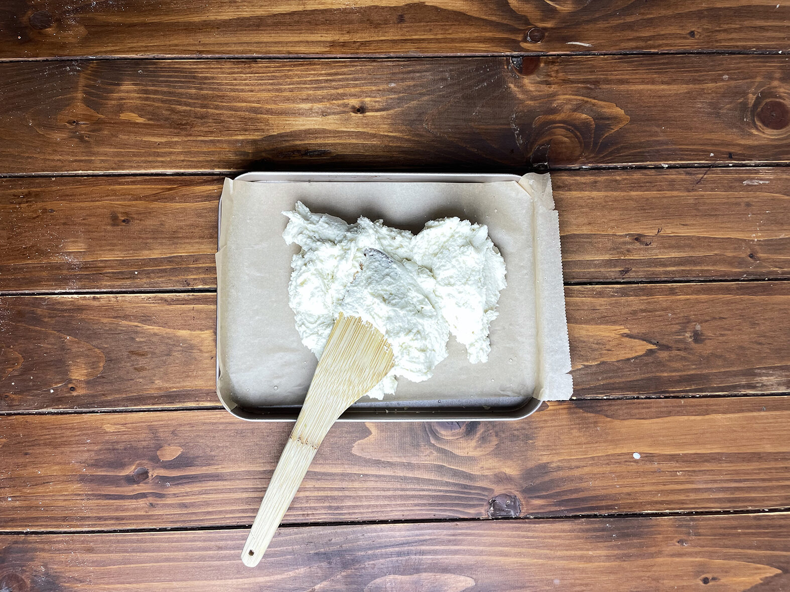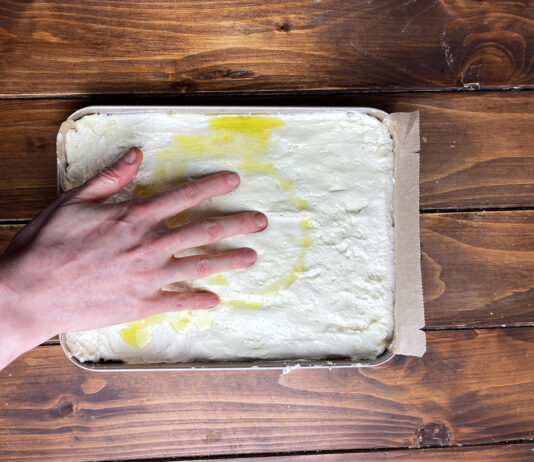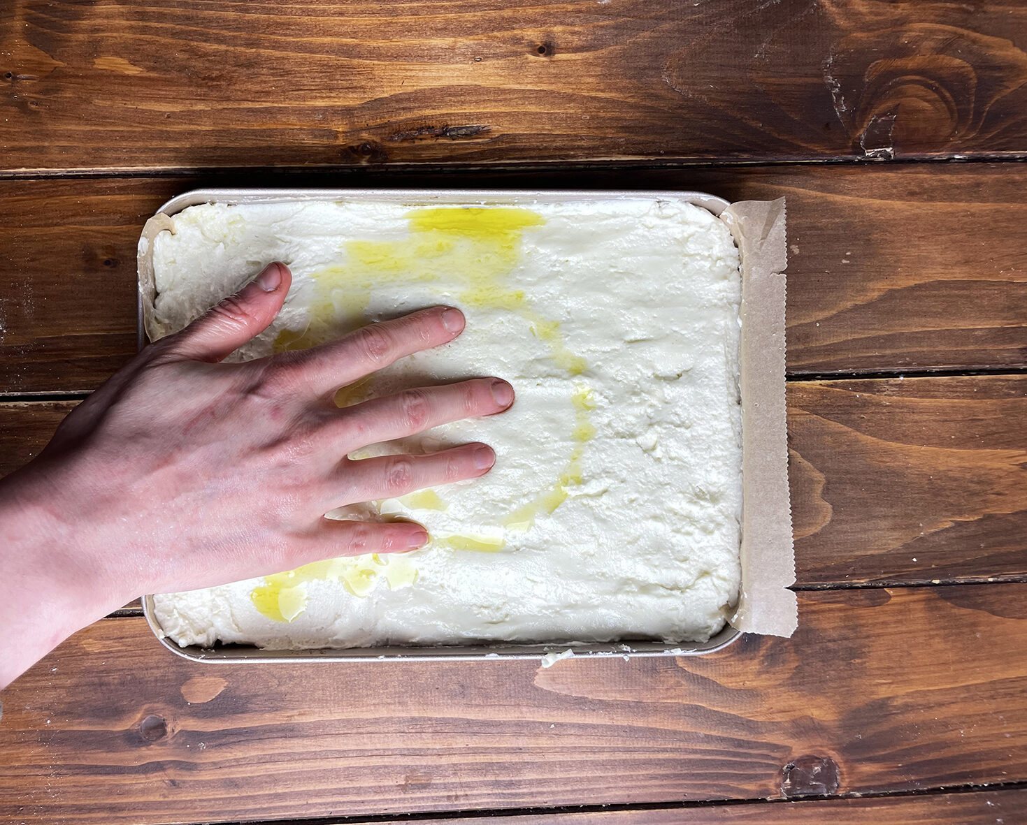 3. Rivestite con carta da forno una teglia rettangolare lunga circa 22 cm. Disponete al centro l’impasto e, con le mani oliate, stendetelo su tutta la base della teglia.