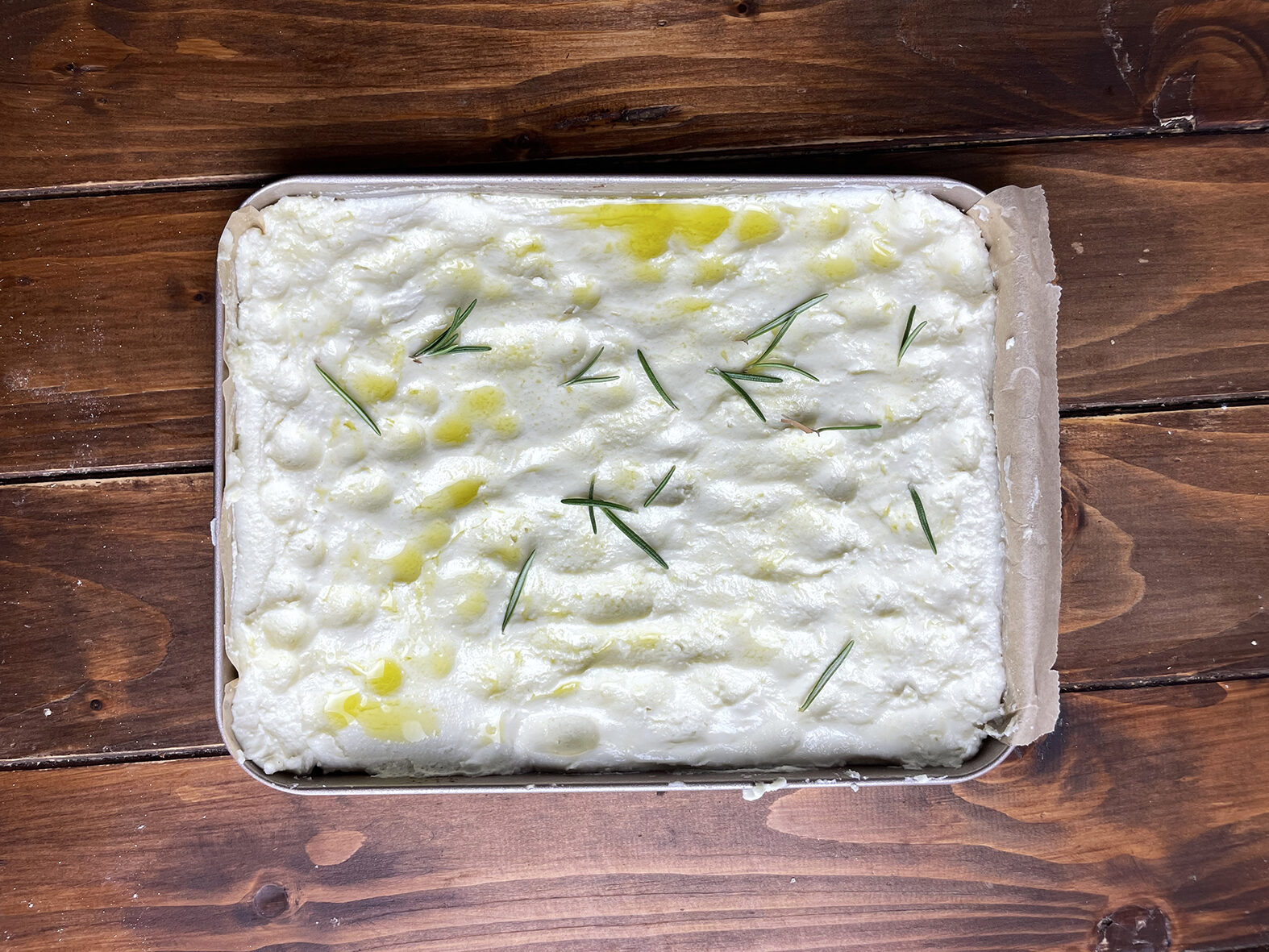 5. Infornate la focaccia a 200 °C per 25 minuti o finché iniziano a comparire in superficie dei puntini dorati. Levatela dal forno e lasciatela intiepidire.