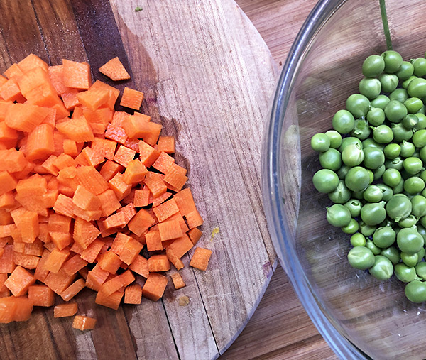Riducete le carote a cubettini e sgranate i piselli.