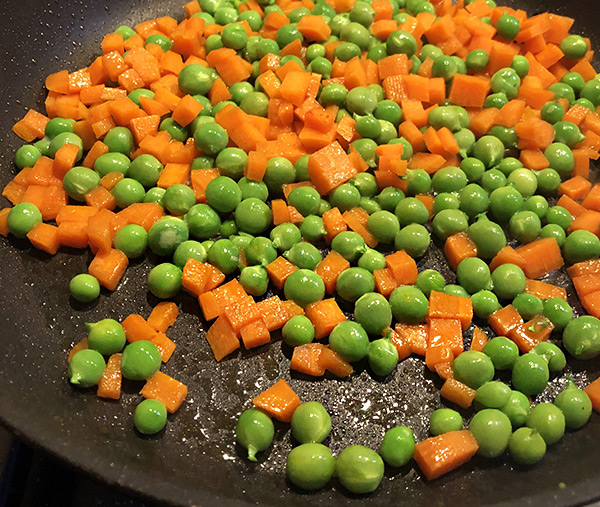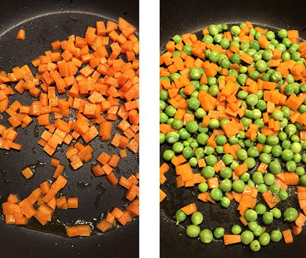 In una padella antiaderente a doppio fondo, rosolate con un filo d'olio prima le carote (5 minuti), poi aggiungete i piselli.