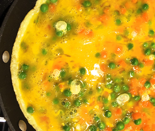 Per insaporire ulteriormente la frittata tritate anche un cipollotto e rosolatelo insieme a carote e piselli.