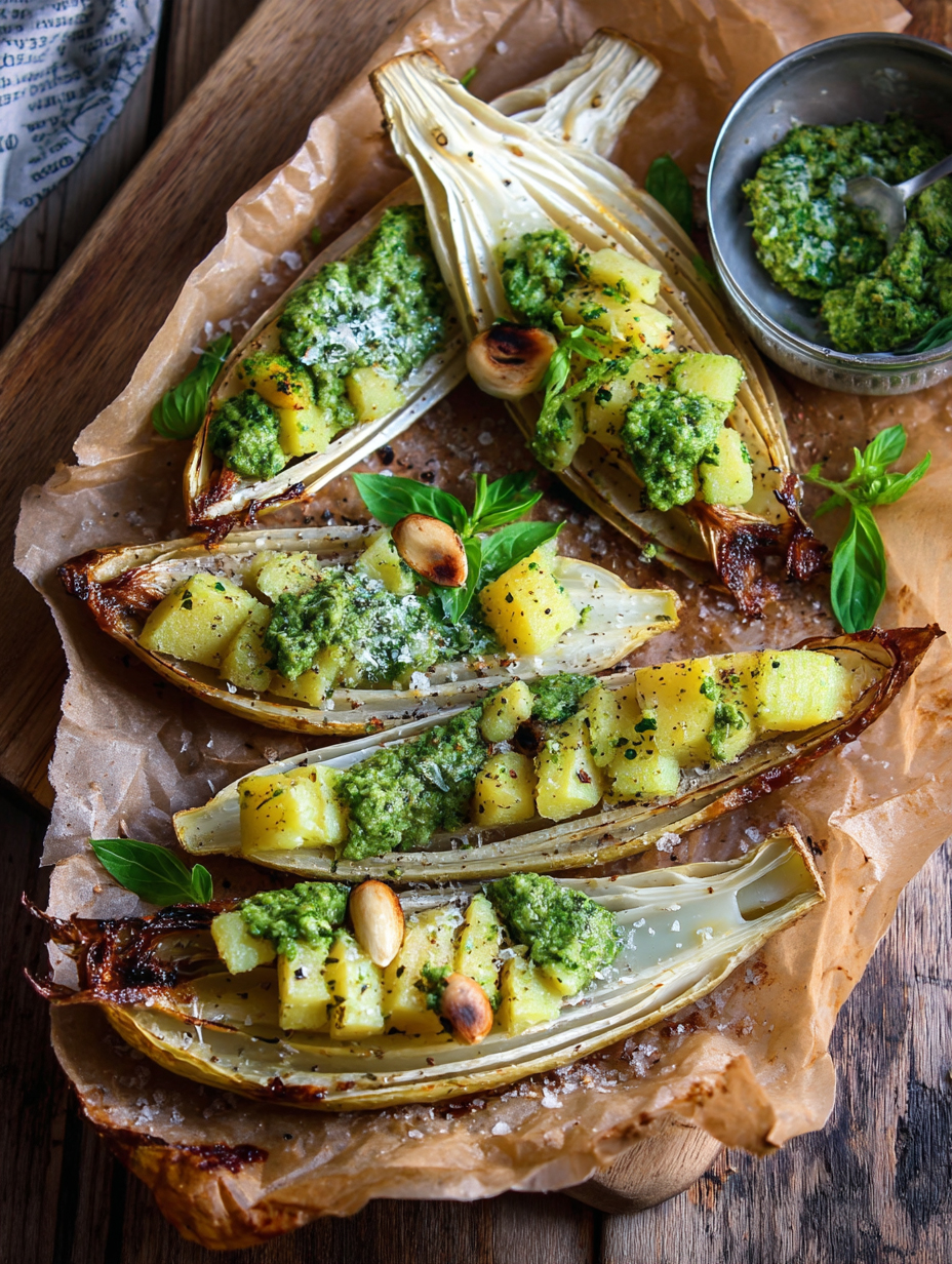 100% vegetale e saziante, l'indivia al forno ripiena di patate al pesto è un contorno delizioso che combina il sapore leggermente amaro dell'insalata belga con la dolcezza delle patatine al pesto.