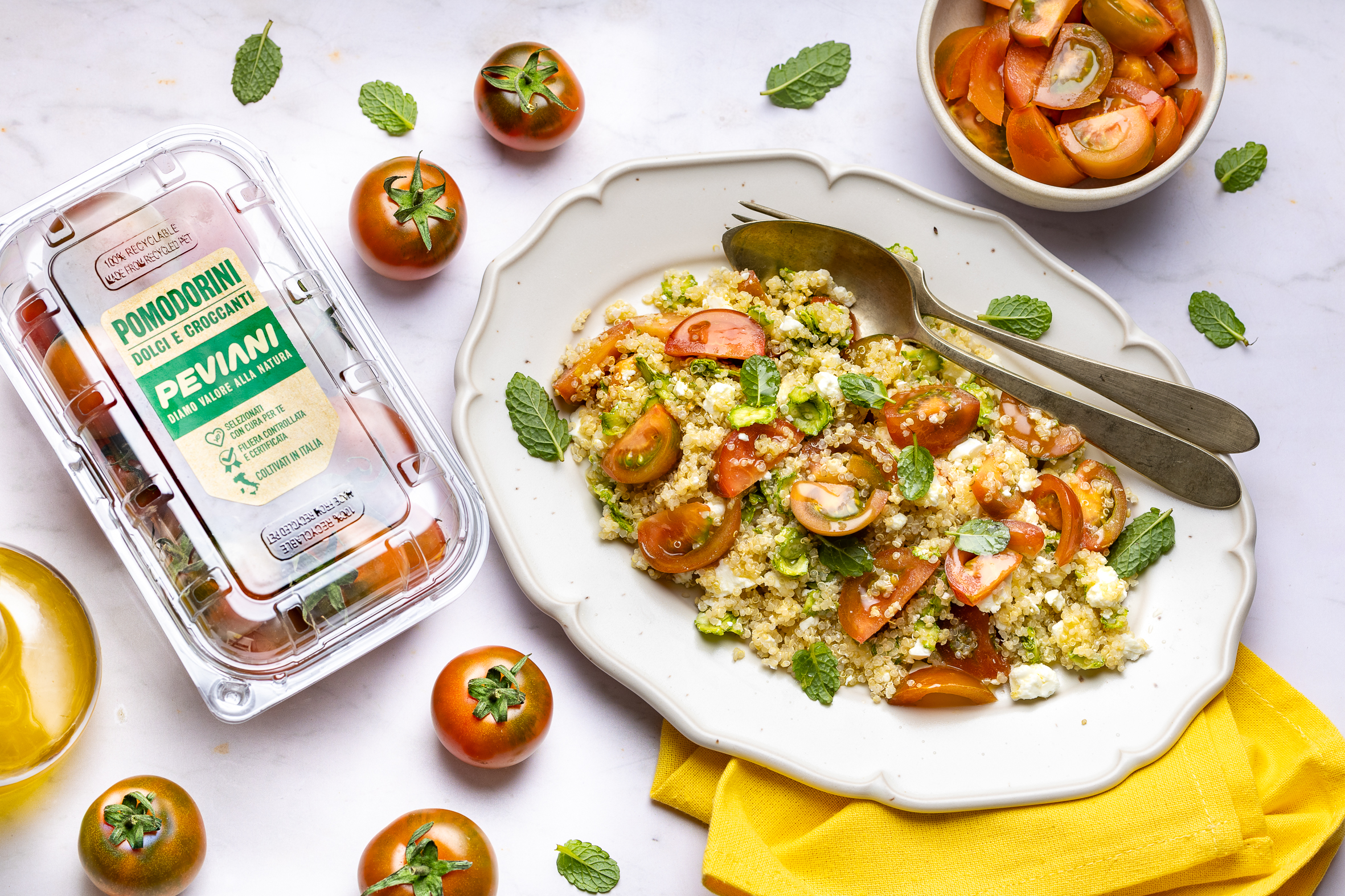 - Lavate i pomodorini, tagliateli a spicchi e conditeli con 2 cucchiai di olio. Scolate le zucchine dalla marinata. Condite la quinoa con i pomodorini, le zucchine e la feta sbriciolata, completando con qualche foglia di menta.