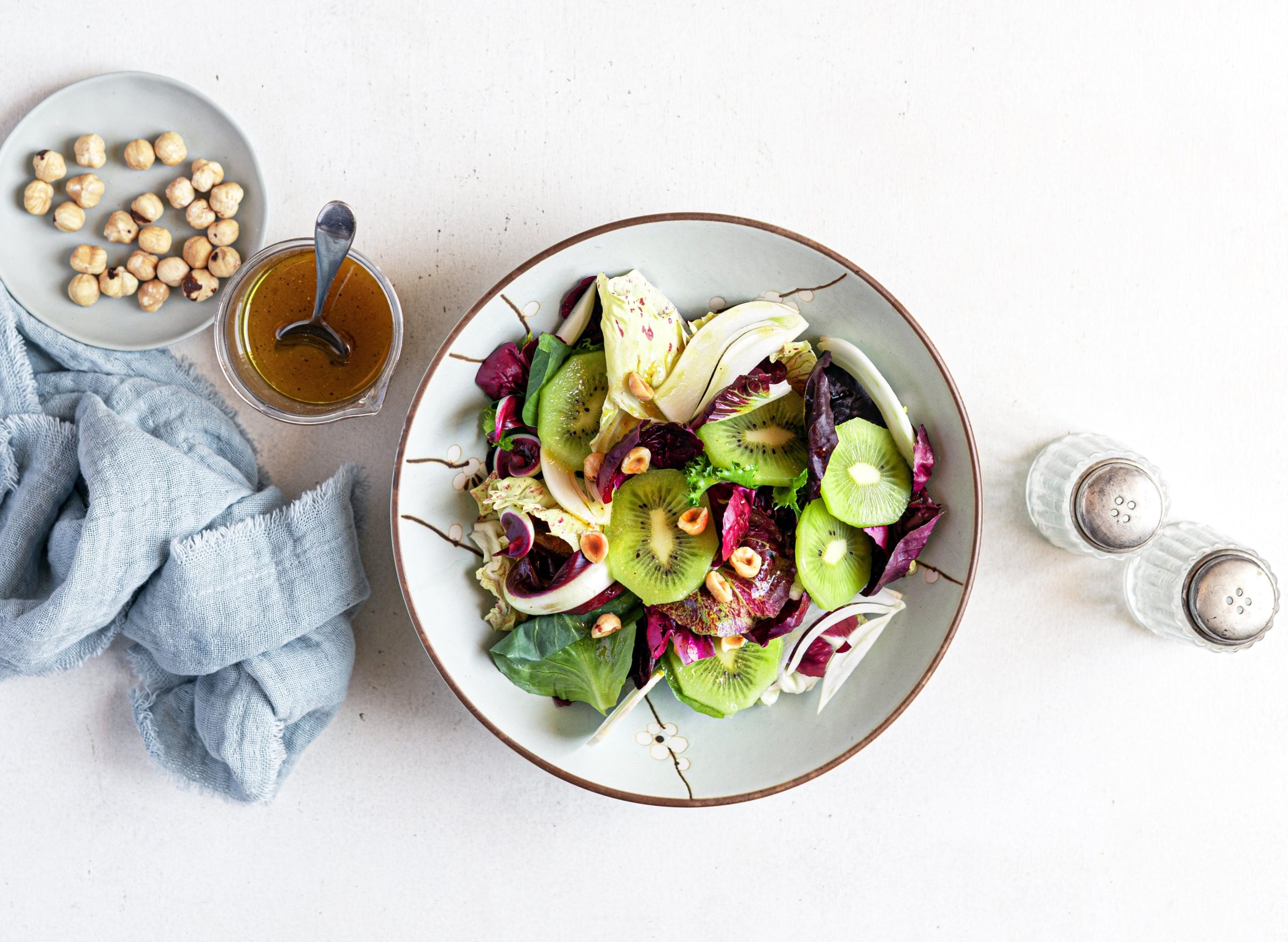 È difficile sintetizzare tutte le sostanze benefiche presenti in questa ricetta, dalle vitamina C di kiwi e insalate ai polifenoli dei radicchi, dalle fibre prebiotiche del cicorino ai probiotici del miso. L'insalata di radicchio al miso con kiwi e nocciole ha solo 190 calorie a persona ed è un vero tripudio di sapori e di proprietà. Se non trovate, o non amate, il miso, potete sostituirlo con un cucchiaio in più di salsa di soia e, se vi piace, una punta di wasabi in pasta. Per una versione agrodolce del condimento, unite un cucchiaino da caffè di miele d’acacia.