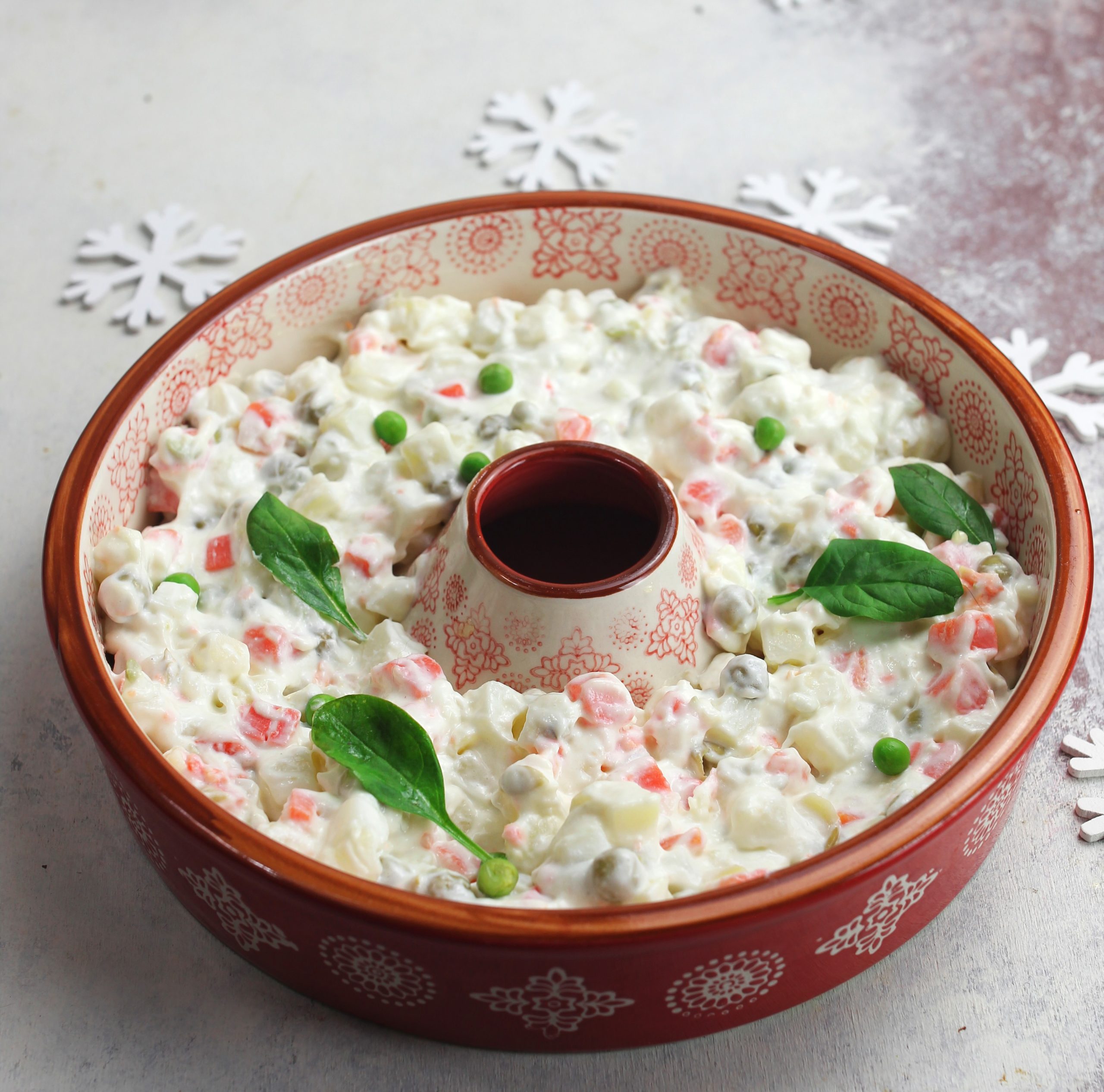 - Sistemate l’insalata russa in una bella ciotola grande e decoratela con qualche foglia di erba aromatica a piacere. Non vi resta che portarla in tavola.