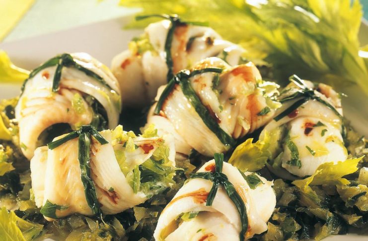 - Lavate il sedano e tritatelo. Farcite ogni filetto di sogliola con un cucchiaio di sedano tritato. Salate e pepate. Arrotolate i filetti, fermandoli con del filo.