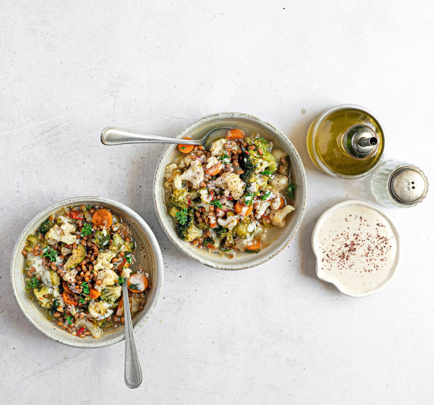 C'è qualcosa di meglio di un piatto che unisce zuppa e crema? Il minestrone di farro e cavoli con crema di cannellini al sesamo è il comfort food vegetale perfetto per le giornate più fredde: verdure di stagione, farro e legumi si incontrano in un mix saporito e pieno di nutrienti. I cavoli e i broccoli sono una vera bomba di antiossidanti, il farro fornisce energia a lento rilascio e la crema di cannellini con tahina regala morbidezza e gusto extra. Servitelo con un giro d’olio, una macinata di pepe e lasciate che ognuno aggiunga la crema a piacere: un piatto sano, colorato e perfetto per ogni occasione.