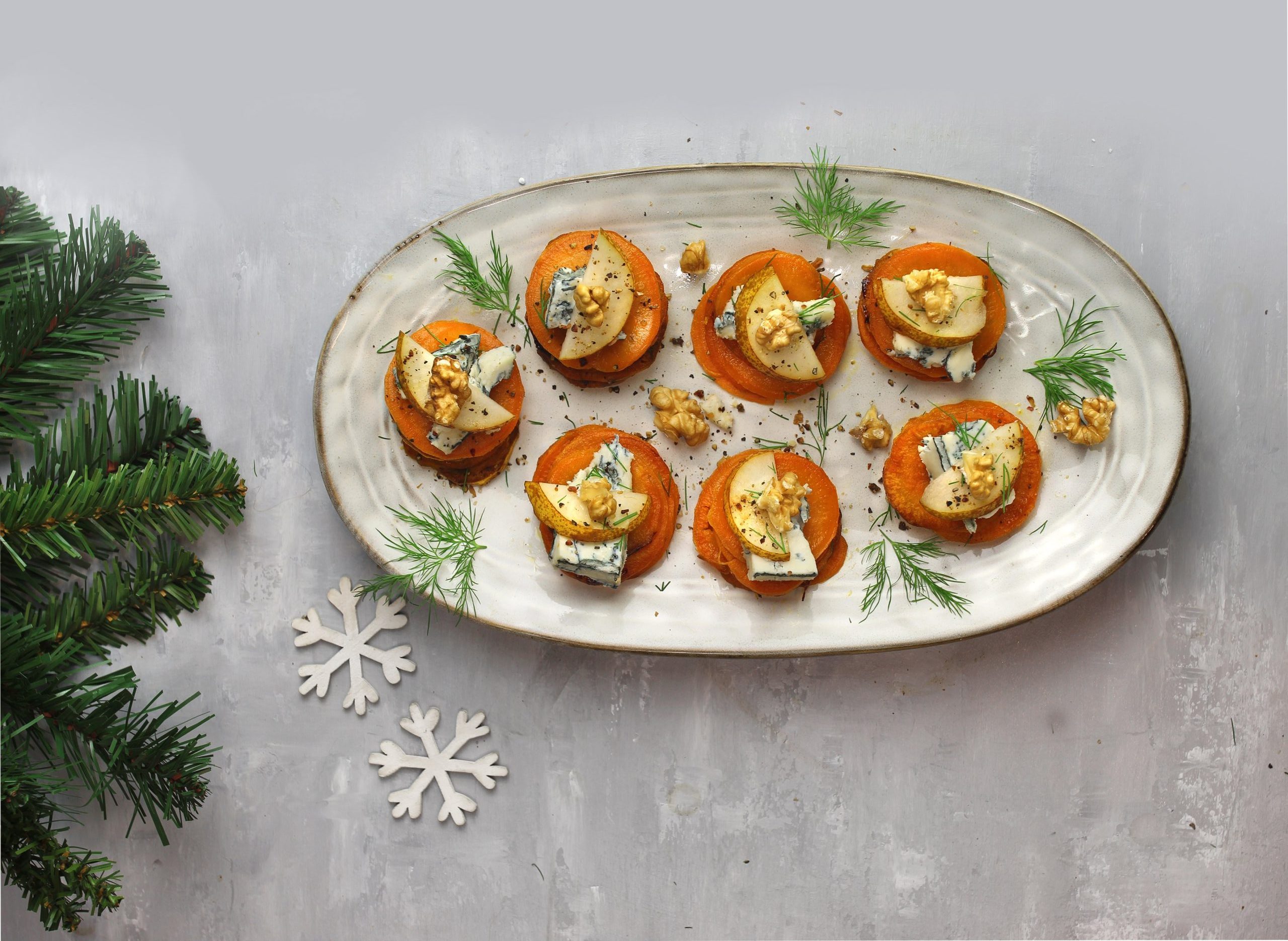 La stessa ricetta delle Mini millefoglie di patate dolci, gorgonzola e pere viene bene anche con normali patate oppure con la zucca per un antipasto di Natale vegetariano, senza glutine e senza uova.