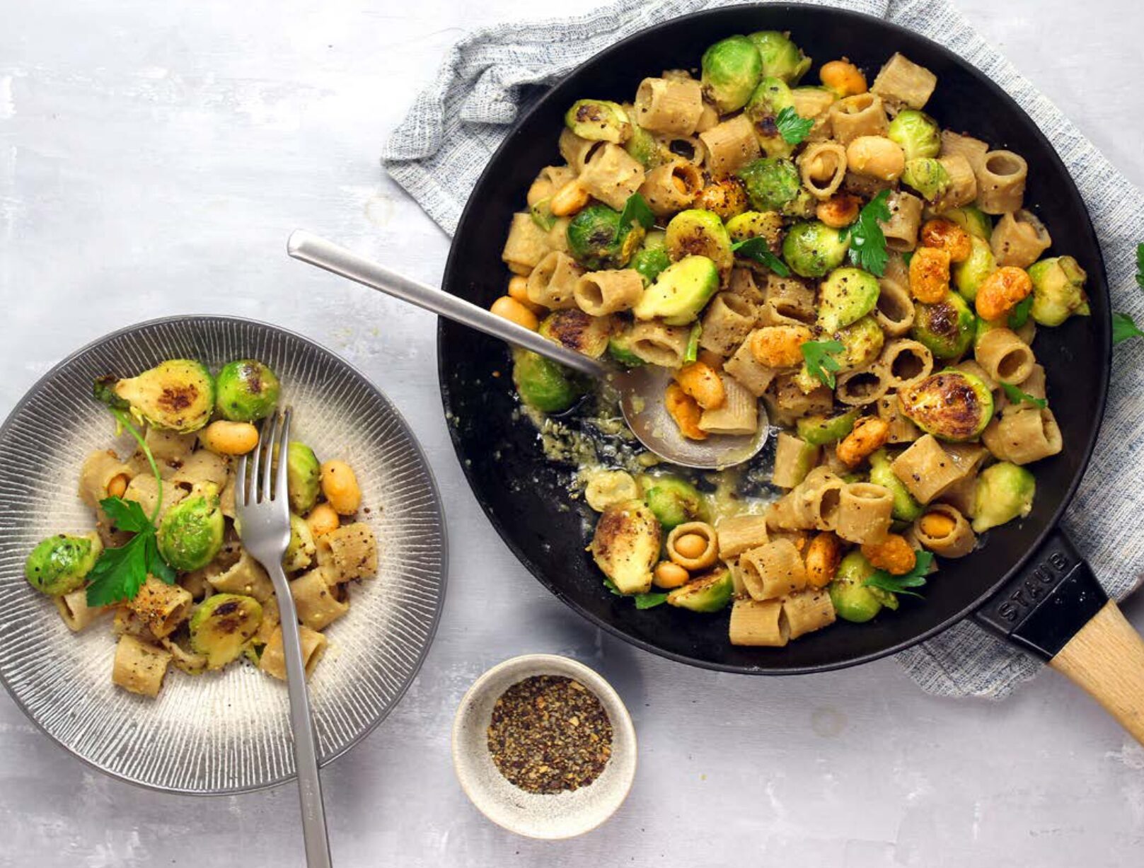 - 5. Versate le mezze maniche al dente direttamente nella padella con i cavoletti, unite anche la crema di fagioli e mantecate brevemente. Completate con il prezzemolo, una macinata finale di pepe e servite.