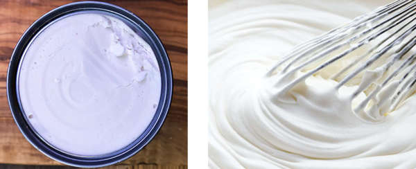 Per una panna montata vegan, togliete dal frigorifero la lattina di latte di cocco intero avendo cura di non scuoterla. La parte grassa del latte sarà nella parte alta della lattina: estraetela con un cucchiaio, lasciando la parte acquosa. Montate la parte grassa del latte di cocco con qualche cucchiaio di zucchero a velo.