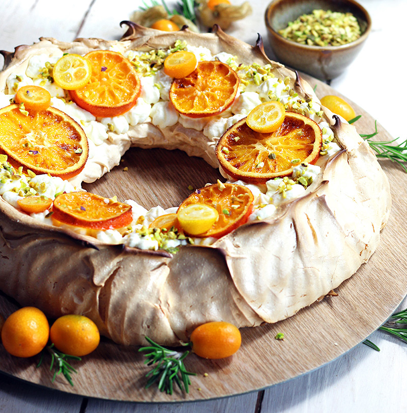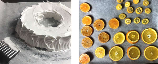 Come vedete, la crema è ampiamente modellabile. Abbassate il forno a 160° e infornate per 1 ora e mezza. Nel frattempo noi abbiamo caramellato le arance immergendeole in uno sciroppo (200g di acqua e 150g di zucchero a bollore finchè si scioglie) e cuocendole sotto la pavlova finchè caramellate. Ma voi potete gustarle con la frutta fresca!