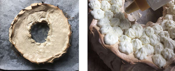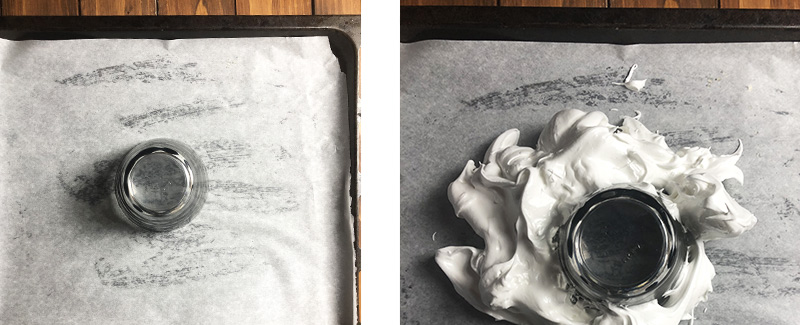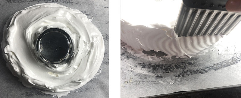 Preriscaldate il forno alla massima temperatura. Ora modellate la pavlova: preparate una placca da forno foderata con carta. Rovesciate un bicchiere grande se volete modellarla a ciambella. Iniziate a distribuire la crema a cucchiaiate intorno al bicchiere.