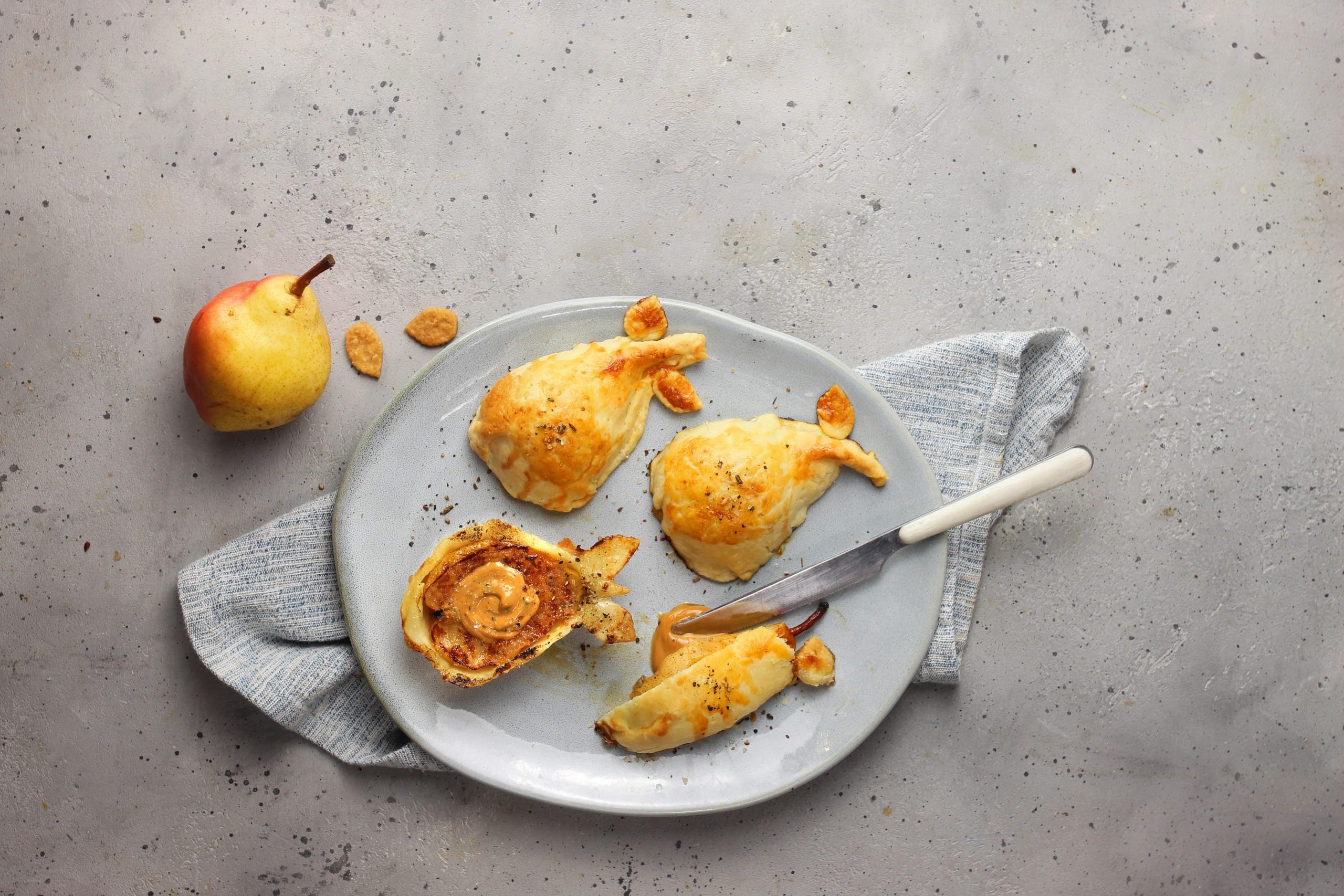 - 4. Spennellate la superficie della pasta con l’uovo battuto e infornate a 200 °C per 10-15 minuti, fino a quando la sfoglia diventa bella dorata. Lasciate intiepidire le pere prima di capovolgerle e guarnirle con un cucchiaino di crema di nocciole.