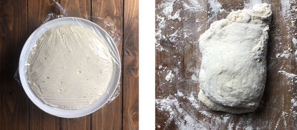 2. L'impasto sarà aumentato di volume. Ora infarinate un piano di lavoro: infarinate molto bene tutto il piano e versatevi l'impasto molliccio. Avendo infarinato la base, potete prenderlo dai due angoli in basso e piegarlo in due. Spolverate ancora poca farina e procedete con quattro piegature. Rimettete in una ciotola il composto, ancora morbidissimo, e coprite con pellicola. Lasciate riposare in frigorifero almeno 6 ore. Oppure tutta la notte (o la giornata, se lo preparate di mattina).