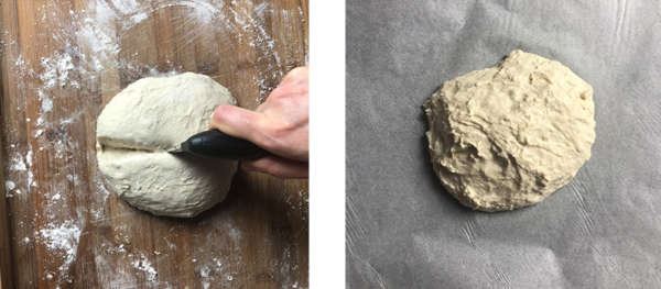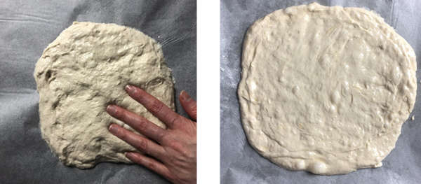 4. Con le mani umide, distendete l'impasto e create un disco. L'impasto rimane sempre molto idratato, per questo non si lavora a matterello (a meno che abbiate incorporato molta farina in precedenza).