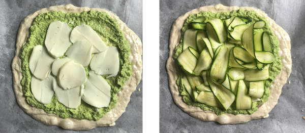 5. Ecco come abbiamo farcito noi: frullate due zucchine crude a tocchetti con 2 pizzichi di sale, 6 mandorle e 4 cucchiai di olio di oliva. Spalmate questa crema verde sulla pizza. Distribuite poi la scamorza a fette. Per i nastri di zucchina: riducete le zucchine a nastri con l'aiuto di un pelapatate, poi conditeli molto bene con olio e sale. A questo punto avete due scelte: adagiarli sopra la pizza per cuocerli insieme (scelta veloce) oppure grigliarli a parte, lasciando cuocere la pizza con il pesto di zucchine e il formaggio.
