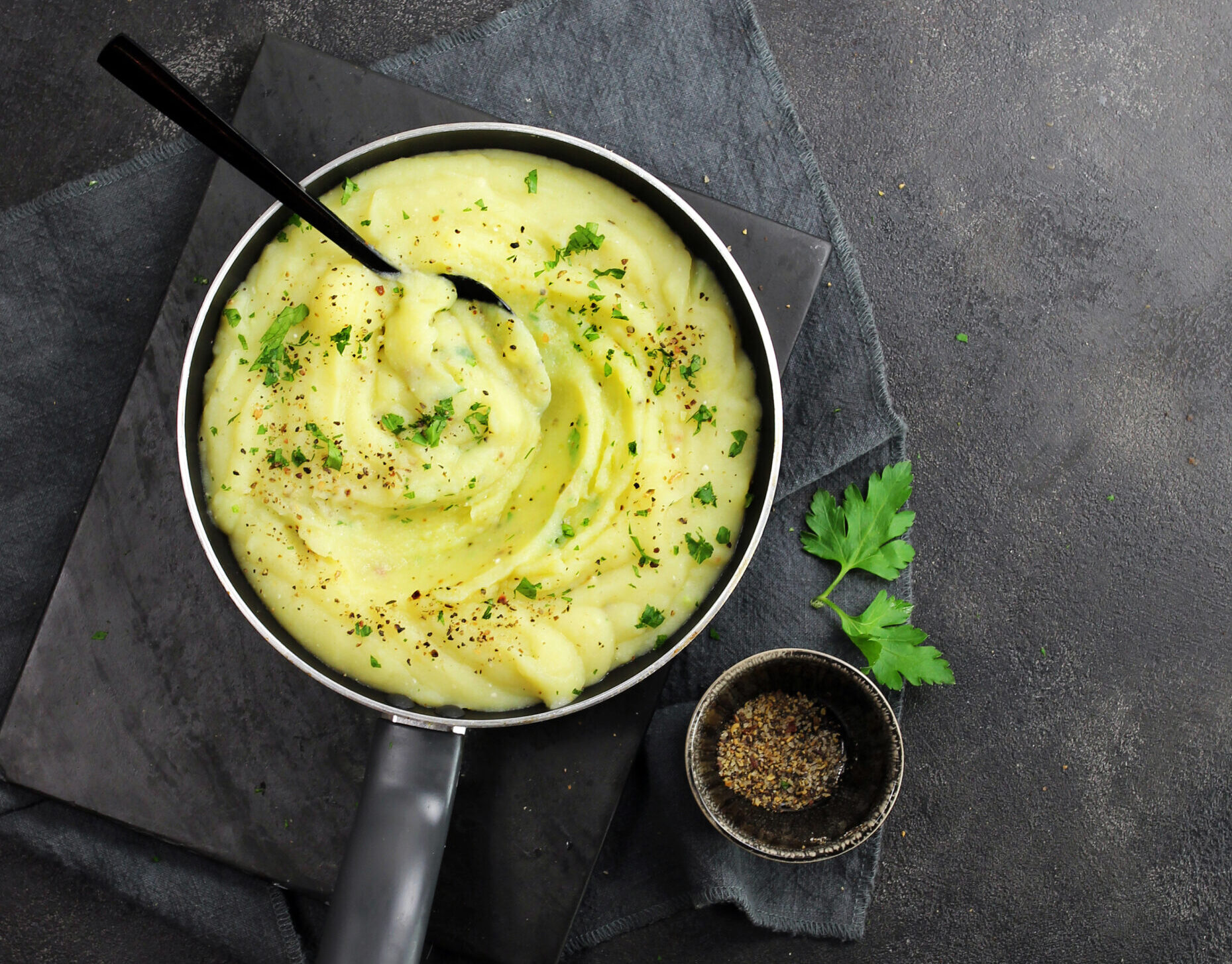 - 4. Aggiungete la crema e a fuoco basso, sempre mescolando, scaldate il purè fino a renderlo omogeneo e ben saporito, unendo man mano il latte necessario. Alla fine controllate il sale, poi completate il purè con il prezzemolo tritato e una macinata di pepe.