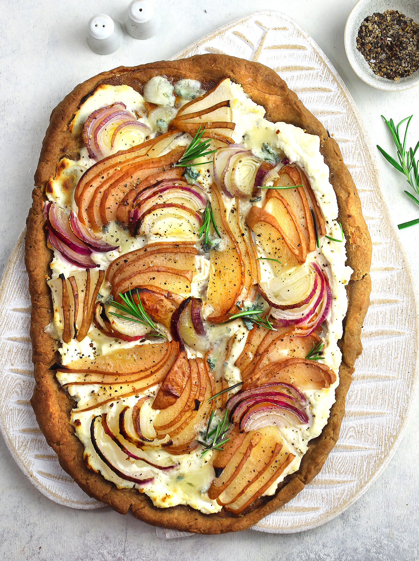 5. Stendete la pasta riposata ottenendo una forma allungata da adagiare in una teglia bassa da circa 25x35 cm, ricoperta con carta da forno. Bucherellate la base di pasta, poi ricopritela con la crema di ricotta, lasciando il cornicione libero. Disponete a ventaglio le fette di pera, lasciando spazio per le cipolle. Tagliate, quindi, le cipolle a metà e poi a fettine: disponete anch’esse a ventaglio negli spazi rimasti.