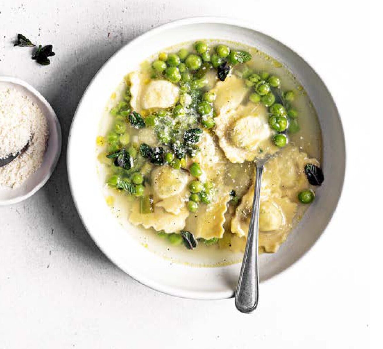 - Distribuite i ravioli e i piselli nelle fondine con un po’ del loro profumato brodo. Completate ogni piatto con un cucchiaio di parmigiano e qualche foglia di menta.