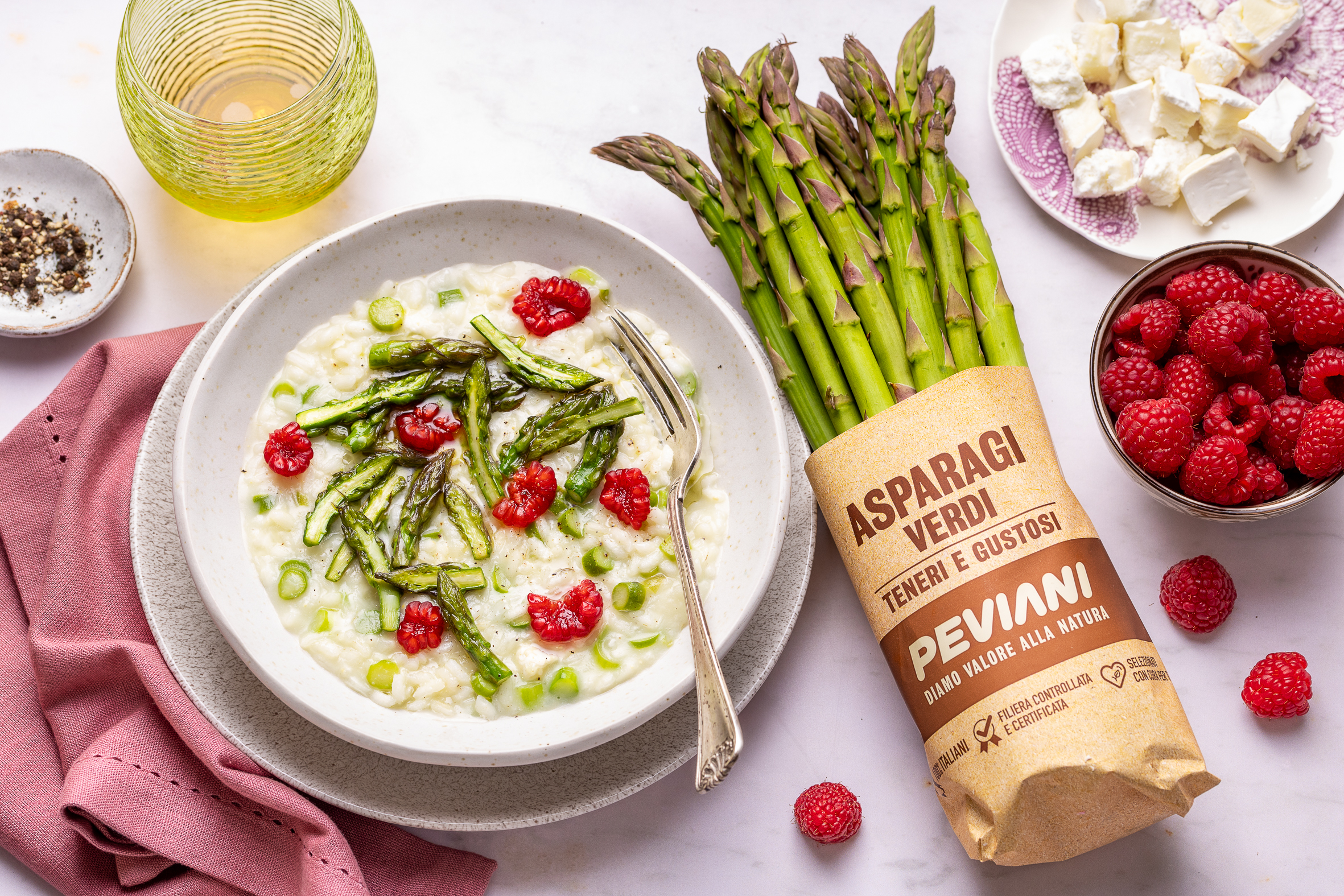 - Servite nei piatti completando con le punte di asparagi, qualche lampone spezzettato e una macinata di pepe.