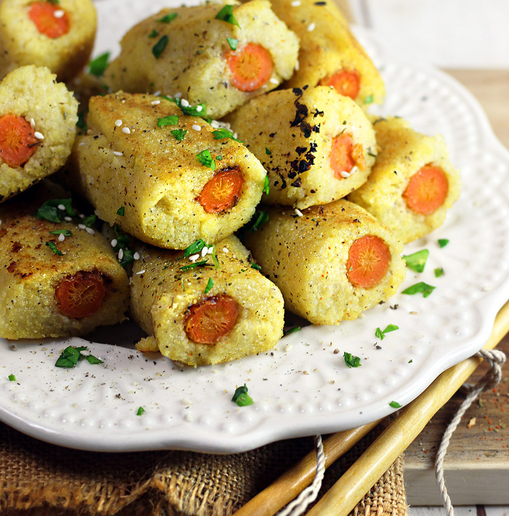 Le salsicce vegane sono involtini di polenta che avvolgono saporitissime carote arrosto. Il risultato sono dei piccoli salsicciotti morbidi fuori e carnosi all'interno: per ottenere un sapore eccezionale arrostite le carote con spezie e aromatiche, come spiegato qui.