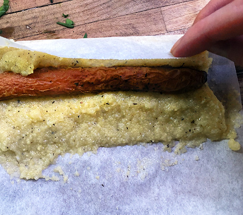 Sfornate le carote arrosto quando cotte e dorate. Ritagliate dei quadretti di carta da forno. Disponete una cucchiaiata di polenta sul foglio cercando di spalmarla a forma di rettangolo. Inserite la carota e arrotolate a involtino aiutandovi con la carta. Lasciate raffreddare per almeno 10 minuti in frigorifero.