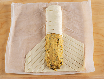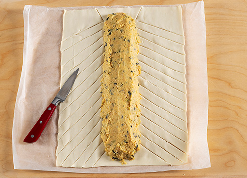 Srotolate la pasta sfoglia su un grande foglio di carta da forno e con un matterello stendetela leggermente fino a ottenere un rettangolo di circa 35x25 cm. Distribuite in senso longitudinale il composto di ceci, formando un polpettone nella parte centrale della sfoglia. Con un coltello incidete i lati della sfoglia rimasta libera ricavando una serie di strisce oblique, alte circa 1 cm e lunghe 12 cm (come da foto qui sopra). Praticate nella sfoglia alle estremità del polpettone un taglio a coda di pesce.