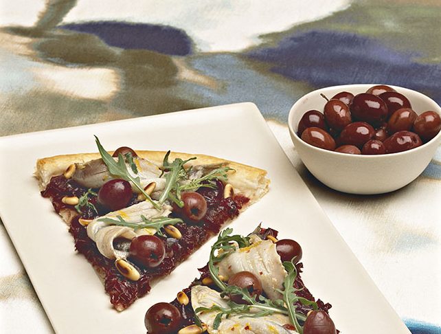 - Adagiate le sfoglie nei piatti e ricopritele con uno strato uniforme di cipolle, distribuite le olive e i pinoli e decorate ciascuna porzione con qualche filetto di acciuga ben sgocciolato. Contornate con la rucola e servite.