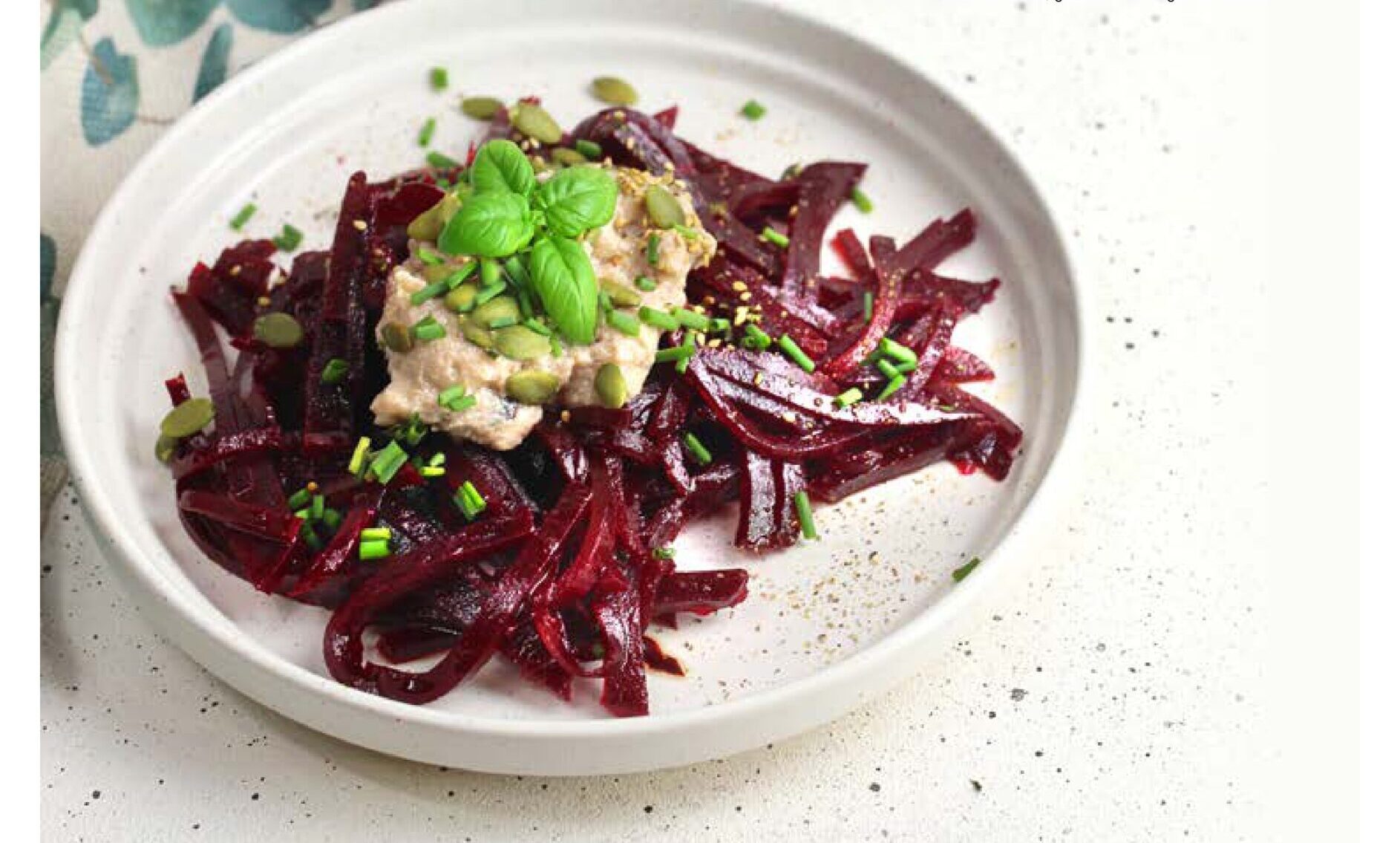 La pasta scompare ma il piacere resta con questa ricetta che propone un modo divertente per rendere ancora più invitanti gli ortaggi stagionali. Ossia trasformarli in lunghe striscioline e condirli con salse piene di sapore. Gli Spaghetti di barbabietola con salsa di noci vegan sono "spaghetti non spaghetti" vegani, senza glutine, senza uova, senza latticini, a basso tasso glicemico e facilissime da preparare.