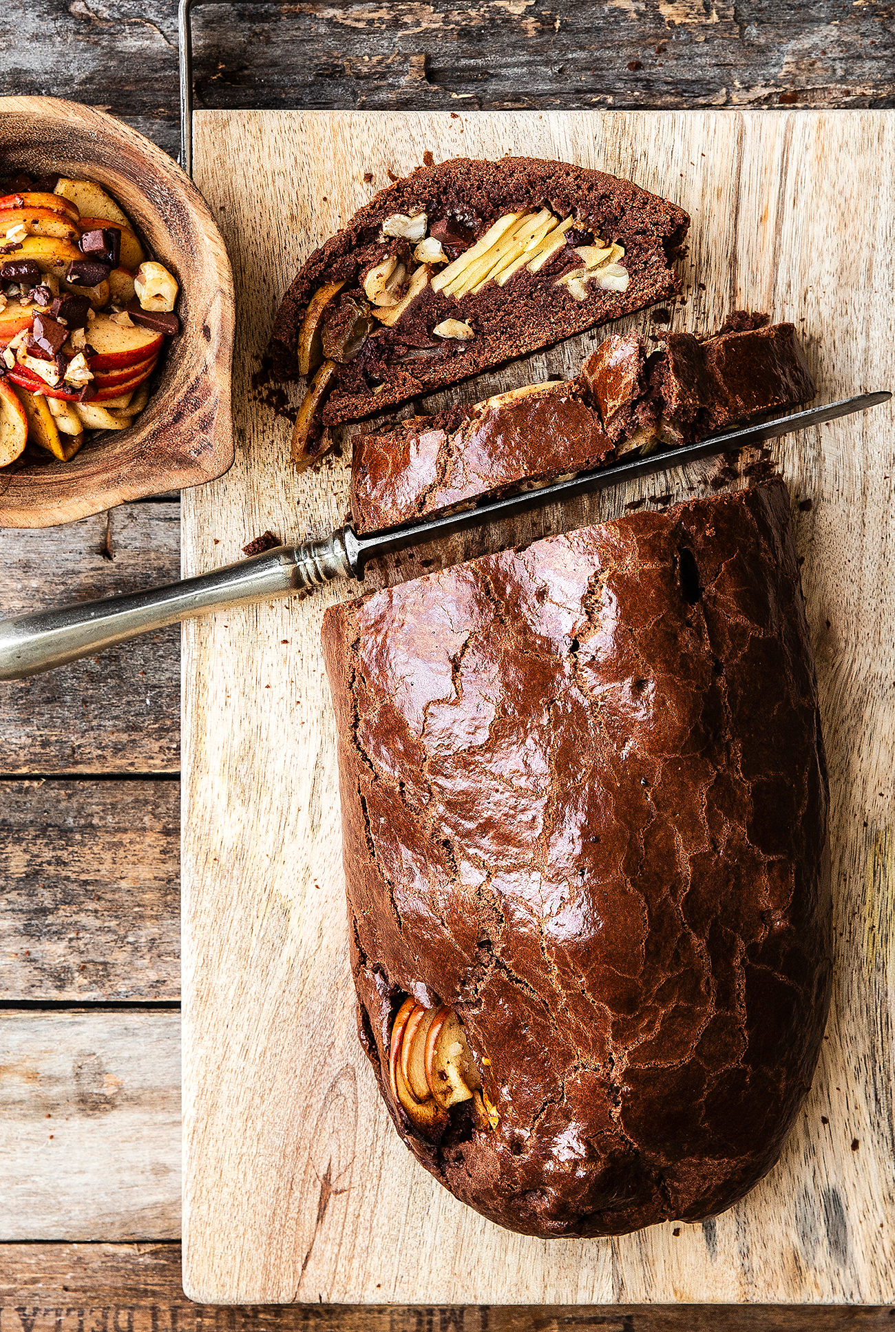 La preparazione dell'impasto vuole un po' di cura: montare il burro, incorporare lo zucchero a velo e il cacao, e lasciarlo riposare per perfezionare la sua consistenza sono regole tassative. Mentre l'impasto si distende al fresco, mele, nocciole, cioccolato e uvetta si uniscono al rum e alla cannella (e dite poco!).