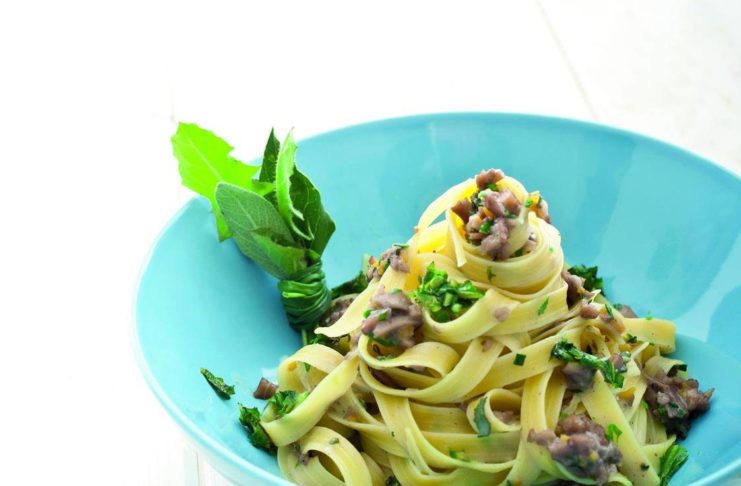 4. Cuocete al dente le tagliatelle in acqua salata, conditele con il ragù cremoso e il tarassaco saltato; potete arrotolare “a cono” la pasta dentro un mestolo grande aiutandovi con un forchettone. Sistemate le tagliatelle nei piatti e spolverate con l’erba cipollina tritata e con altre erbe aromatiche a piacere.