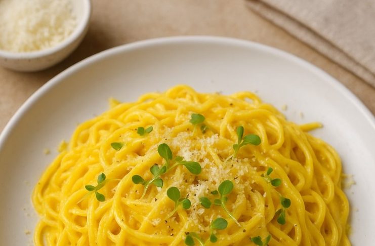 - Scolatela e mettetela in una zuppiera preriscaldata, con 2 cucchiai della sua acqua di cottura. Conditela con la salsa allo zafferano e i germogli di crescione
