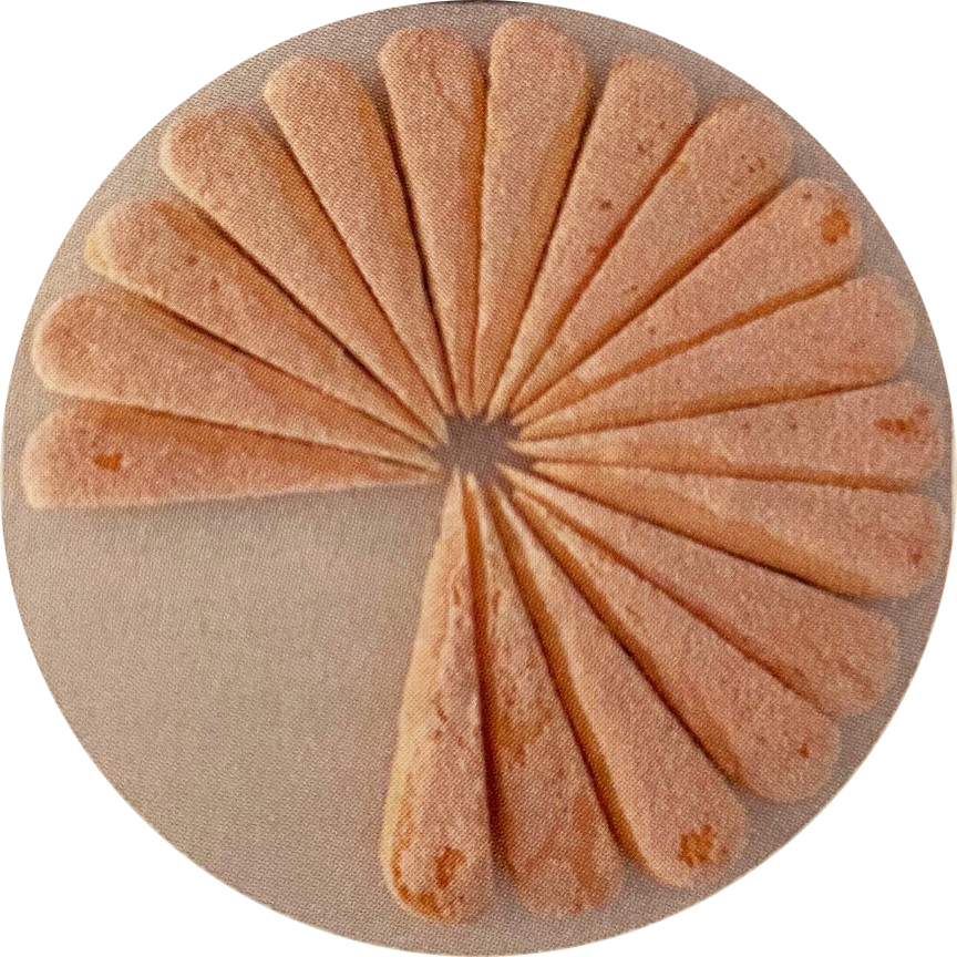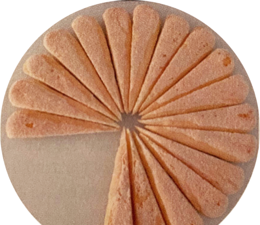 Preparate un bel vassoio tondo con un diametro di 24-26 cm oppure, se preferite una maggiore stabilità del dolce, una pirofila tonda da 20-22 cm. Tagliate i savoiardi per il lungo in diagonale, come vedete nella foto: ve ne serviranno 12 per ognuno dei 3 strati. Immergete 12 savoiardi divisi nella bagna al cacao e disponeteli a raggiera formando una base tonda nella parte centrale del vassoio (o nella pirofila), poi aggiungete uno strato di mousse, stesa con una spatola oppure ridotta in fiocchi con una sacca da pasticcere. Bagnate un’altra dozzina di savoiardi divisi a metà nella bagna e formate il secondo strato, poi proseguite nello stesso modo per il terzo. Terminate con la mousse.