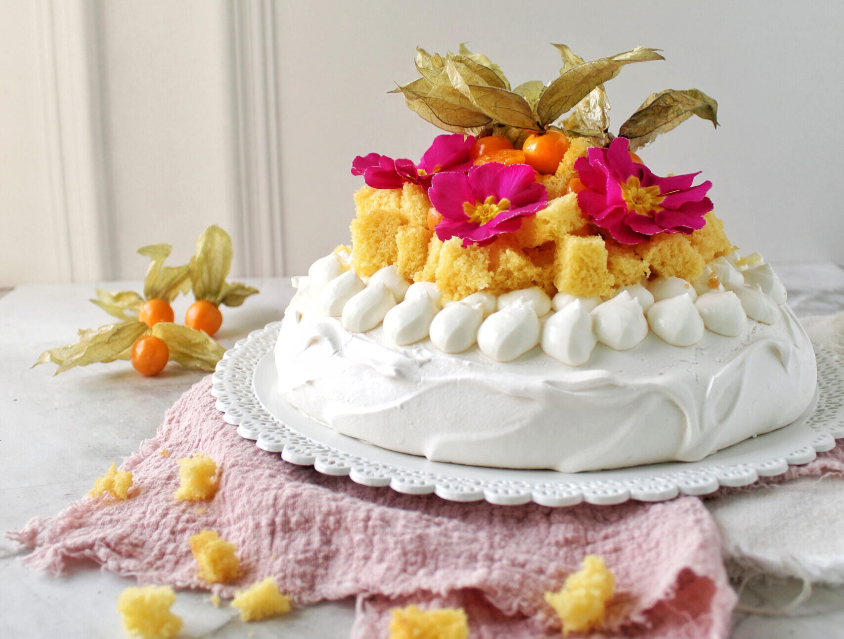 - Trasferite lo yogurt in una sacca da pasticcere con beccuccio liscio e decorate l’esterno della base di meringa con tanti piccoli ciuffetti. Distribuite nell’incavo i cubetti di mimosa e decorate con fiori eduli e alchechengi.
