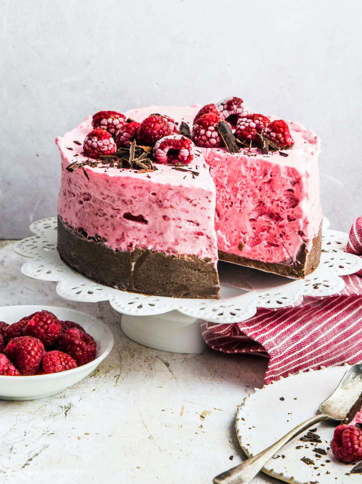 - Tenete la torta nel freezer per circa 4 ore e servitela aggiungendovi i restanti lamponi e il cioccolato fondente ridotto in piccole scaglie.