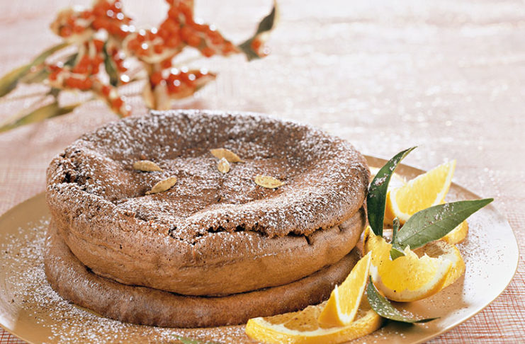 6. Sformatela su un piatto da portata. Cospargetela con un po’ di cacao. Mettetevi intorno le fette d’arancia e spolverizzatele con zucchero e cacao. Se a tavola ci sono bambini eliminate il cardamomo poiché potrebbero non gradire il suo aroma insolito.
