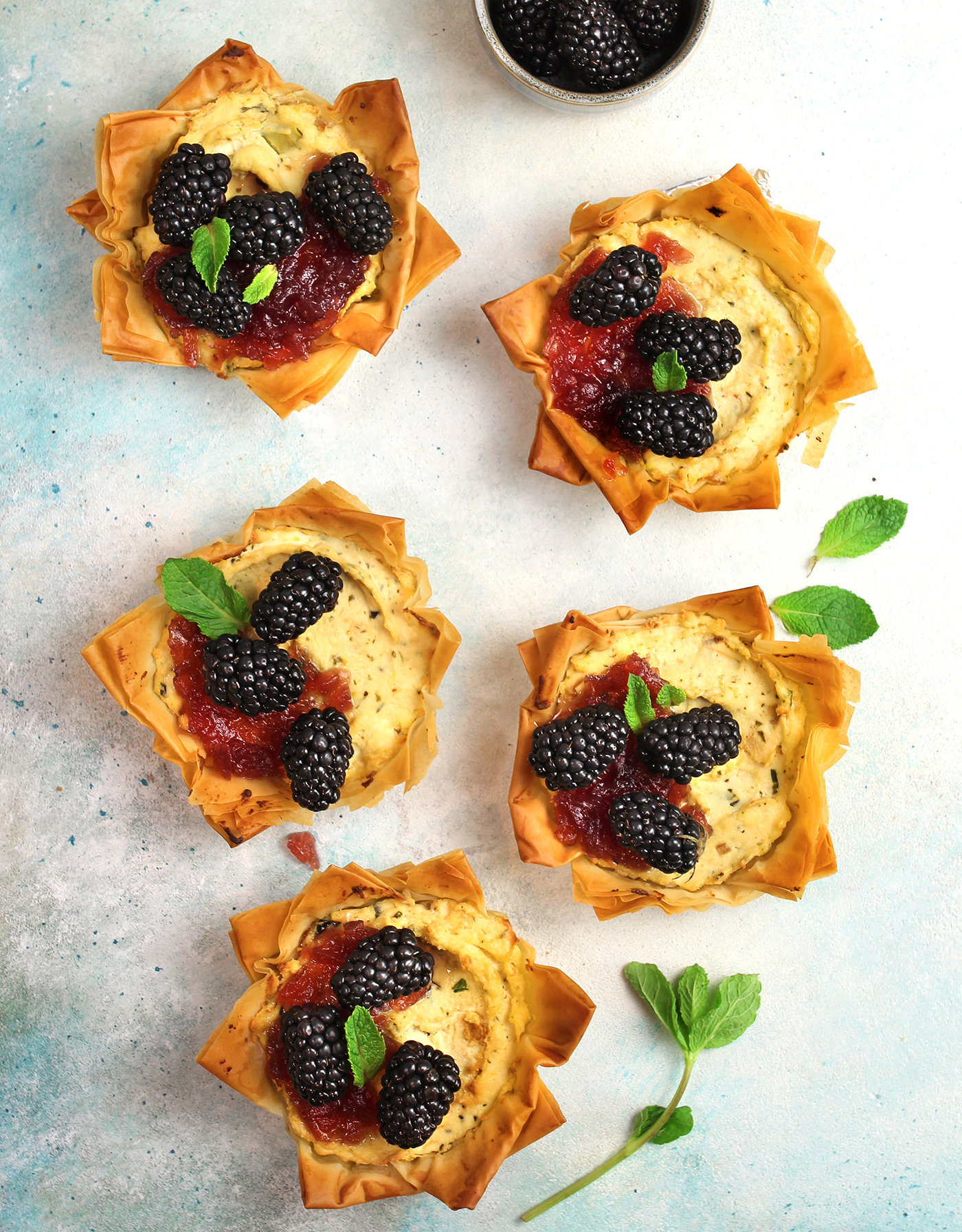 Se cercate un dolce semplice, veloce, senza uova e con pochi grassi, queste tortine croccanti di fillo, ricotta e more fanno al caso vostro. La croccantezza della pasta fillo incontra la morbidezza della crema di ricotta, mentre le more fresche, aggiunte a crudo sulla superficie, regalano una dose extra di fibre e antiossidanti. Una ricetta versatile, perfetta per un dessert dell’ultimo minuto, una merenda speciale o un buffet dolce.