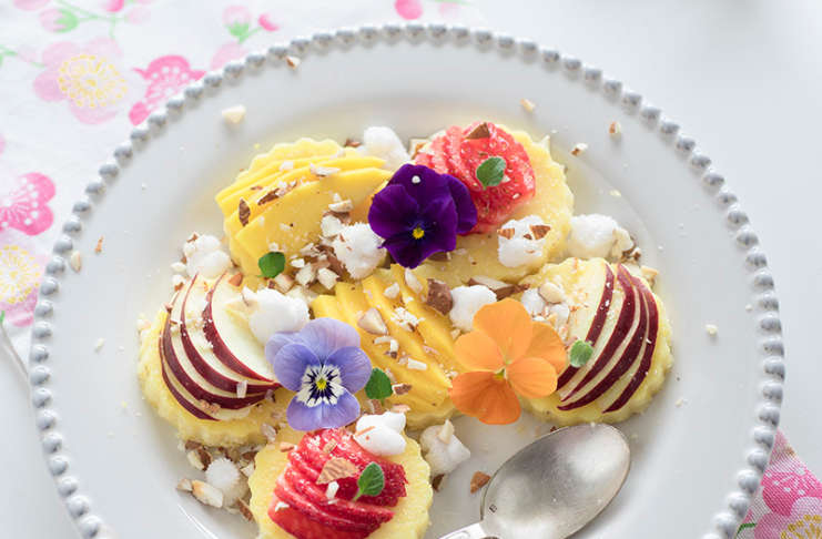 4. Aiutandovi con uno stampo da circa 4 cm circa di diametro riducete la polenta in tortine e disponetele nei piatti. Con la tasca da pasticcere spremete sulla loro superficie un po’ di crema di cocco e adagiatevi la frutta.
