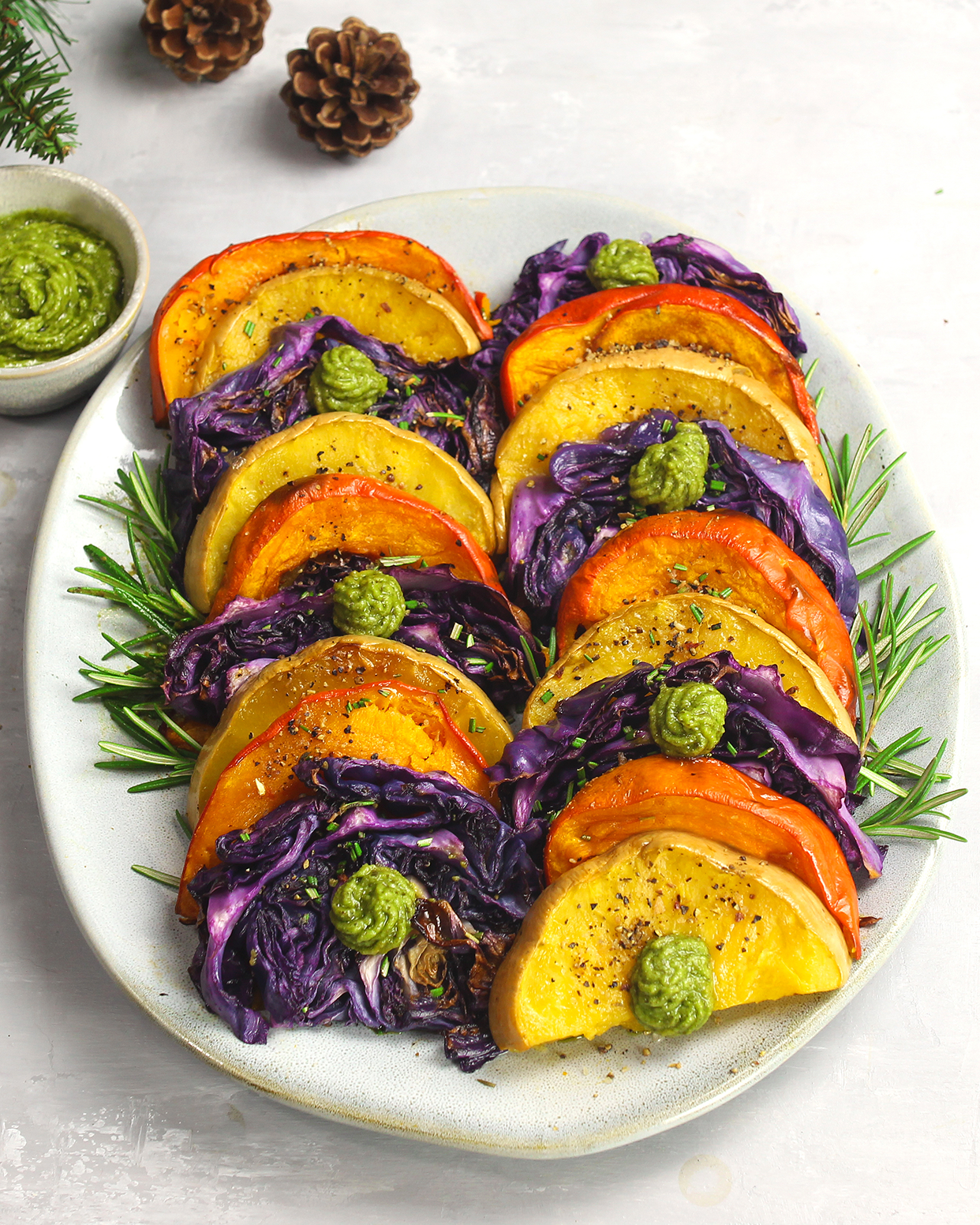 Il tris di verdure al forno con pesto di pistacchi è un contorno vegan pensato per il periodo natalizio, scenografico e semplice da preparare. Zucca e cavolo rosso cuociono insieme in forno e mantengono una consistenza piacevole. Il pesto di pistacchi, pronto in pochi minuti, aggiunge una nota fresca che lega bene il tutto. Una proposta pratica e completamente vegetale, adatta a completare senza fatica il menu delle feste.
