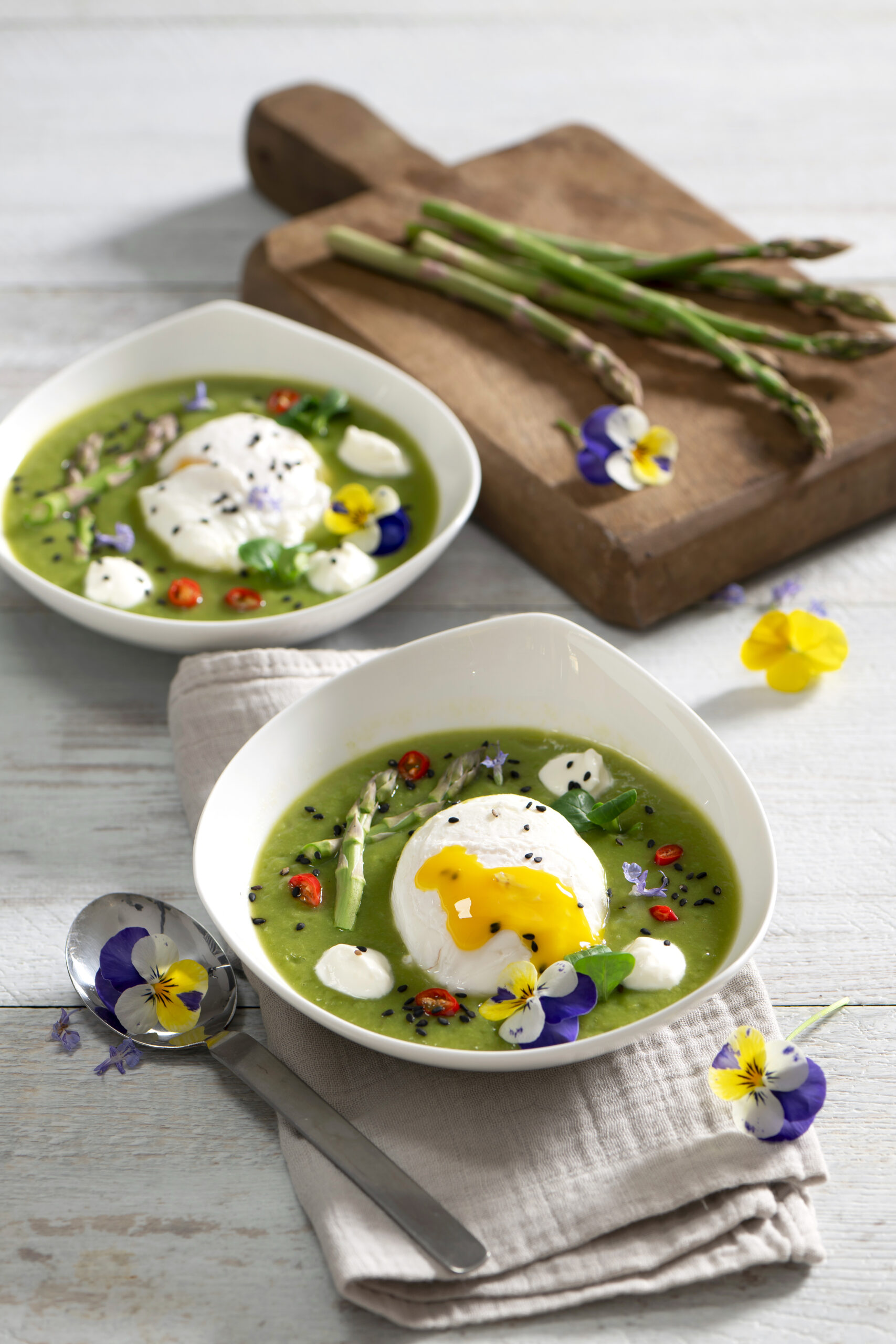 - Distribuite la vellutata nei piatti, posando al centro le uova ben asciugate e private dalle frange irregolari di albume. Contornate le uova con fiocchetti di mousse di mozzarella (aiutatevi con un cucchiaino se non usate la sacca). Proseguite la decorazione con le punte degli asparagi, il sesamo nero, la polpa dei peperoncini tagliata a cubetti, qualche goccia d’olio a crudo, ciuffetti di valerianella e i fiori eduli.