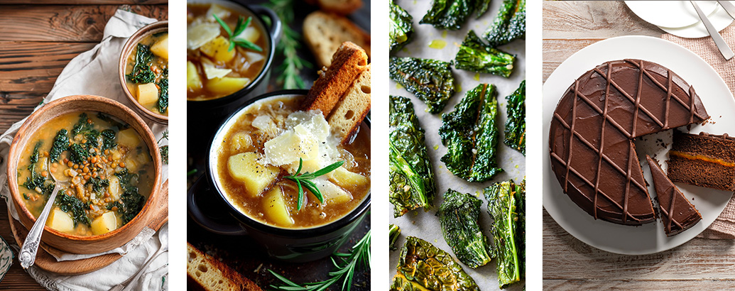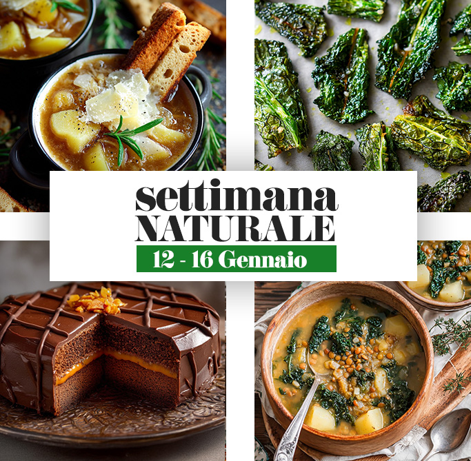 In questa settimana ci sintonizziamo con la natura e la stagione, e scegliamo alimenti che non solo nutrono ma riscaldano il corpo dall'interno: cavolo nero in polpette da servire calde, poi ancora in un hummus delizioso; la verza che si trasforma in cotoletta, il cavolo cappuccio in gnudi colorati, il radicchio come guarnizione per una farinata e le lenticchie in zuppa. Come dessert ci concediamo una sacher, ma senza latticini (quindi senza burro e senza panna).