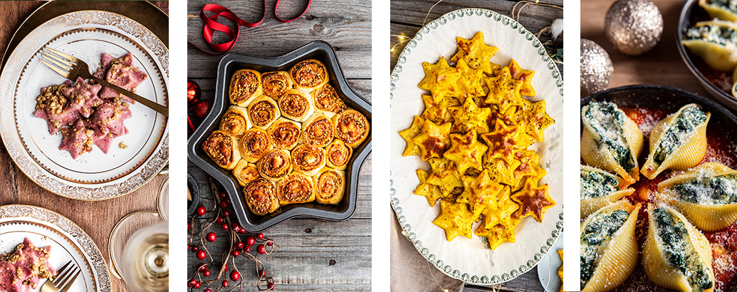Stelle ovunque: intagliate, dorate, croccanti, morbide e lievitate. Stelle anche dove non te le aspetti - tipo conchiglioni di pasta ripiena o cannoli di patate disposti a stella.