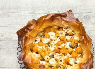 5 ricette con la zucca: Crostata di pasta fillo con zucca, provola affumicata e salvia – Mafaldine alla carbonara vegan con salvia croccante – Insalata tiepida di quinoa alla zucca con quartirolo e rucola – Scaloppine di seitan con zucca – Crumble di grano saraceno con zucca e mela