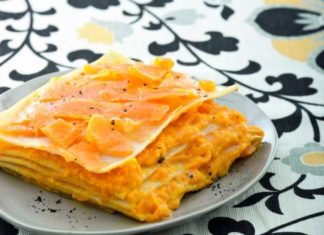 5 ricette con la zucca: Lasagne di kamut alla crema di zucca e carote - Insalata con ceci e mela in salsa di zucca e nocciole - Focaccia al curry cotta al vapore e zucca - Crema andalusa di ceci e zucca con pere - Bavette con salsa di zucca, tofu e funghi