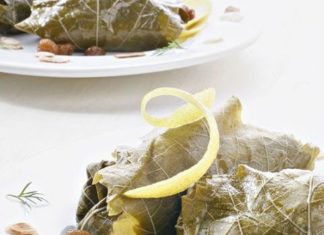 5 ricette di stagione: Foglie di vite ripiene di riso e menta - Insalata di funghi e melanzane con mais e olive - Cuscus alla zucca con ceci e uvetta - Aspic dolce-salato con formaggio e frutta - Pesche marinate alla vaniglia con frutti di bosco e salsa di fichi