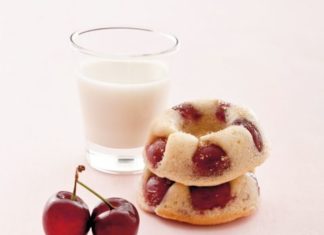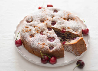5 ricette con le ciliegie: Focaccia dolce con ciliegie - Ciambelline di mais e ciliegie con latte di cocco alla vaniglia - Semifreddo di ricotta e ciliegie con cialde croccanti al cacao - Macedonia ghiacciata con melone e ciliegie alla menta - Muffin alle ciliegie con le noci