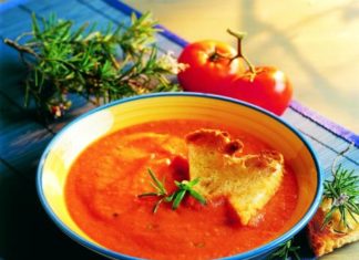 5 ricette con il rosmarino: Zuppa di pomodoro al rosmarino - Focaccia ci ceci con rosmarino e aglio - Trenette al pesto di noci, rosmarino e timo - Filetto di trota al rosmarino e miele d'acacia - Sorbetto al rosmarino con lamponi e fragole di bosco