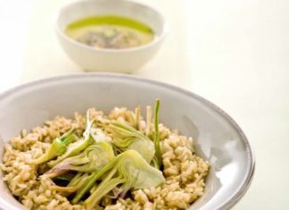 5 ricette con il riso: Riso integrale con carciofi croccanti - Sformatini di riso e spinaci in crema di zucca - Minestra di ceci e riso al limone - Riso integrale con ceci e indivia - Dolce di riso alla vaniglia con cioccolato e pistacchi